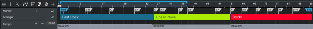 さらに、曲調を示す構成注記をアレンジャー・トラックに入れるとよりわかりやすいと思う。2011年課題曲は、Fast Rock、Bossa Nova および Rock の3部構成となっている。この構成にしたがって色分けでもしておくとよい。ちなみにアレンジャー・トラック機能は、つい先月のメンテナンス・アップデートでPrime版でも利用可能になった。